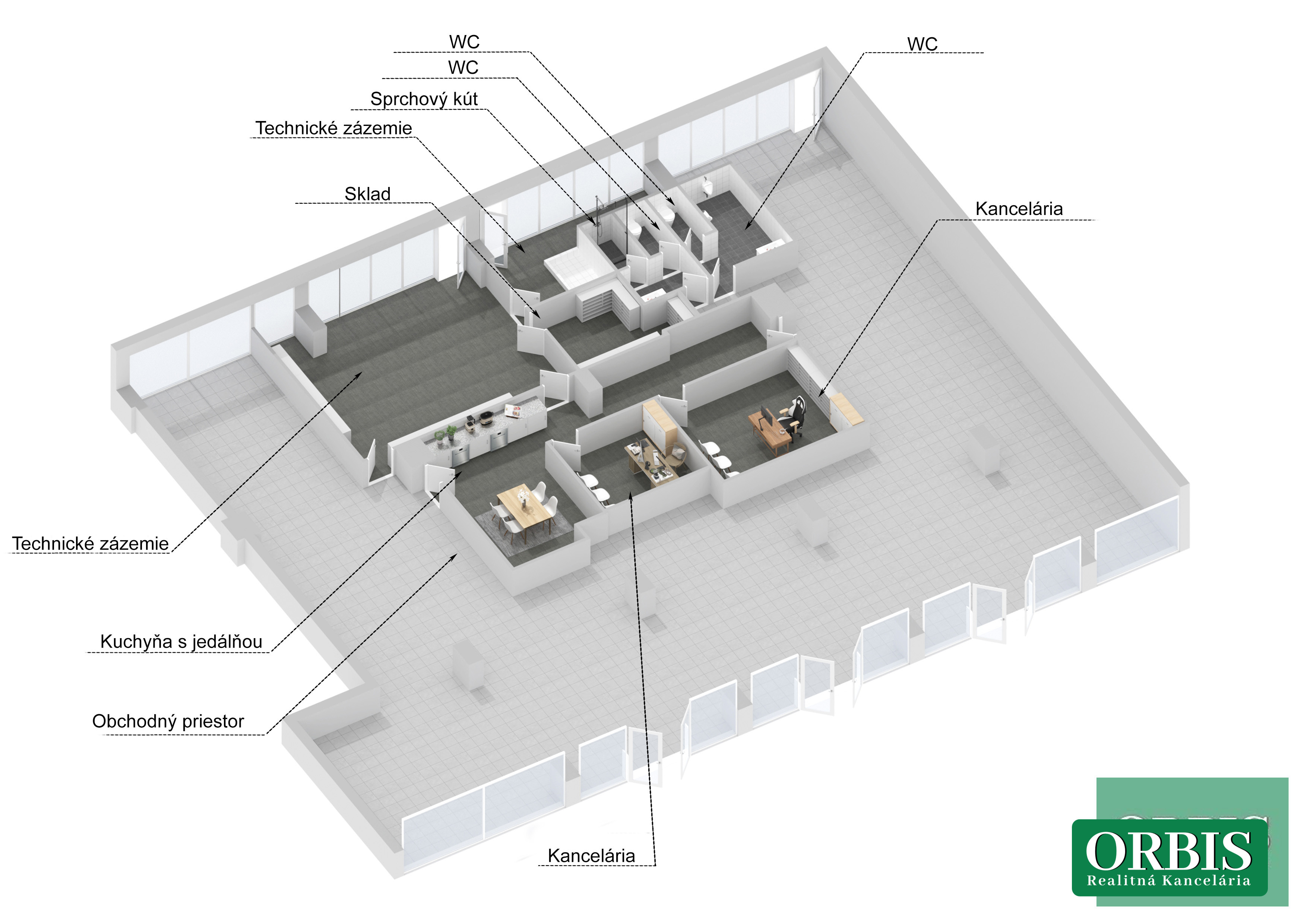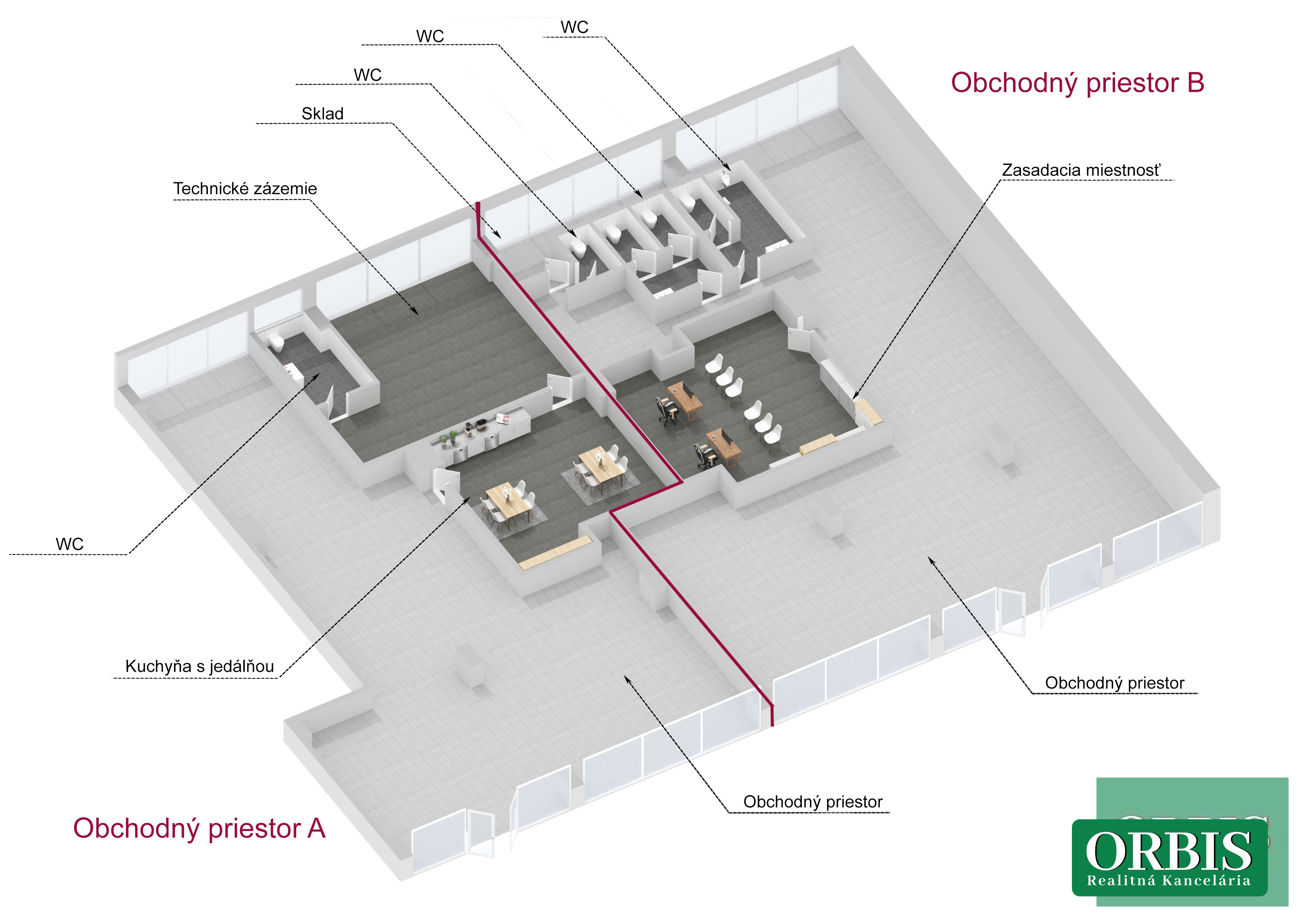 • veľkorysý otvorený priestor vhodný pre showroom, predajňu, kancelárie a iné